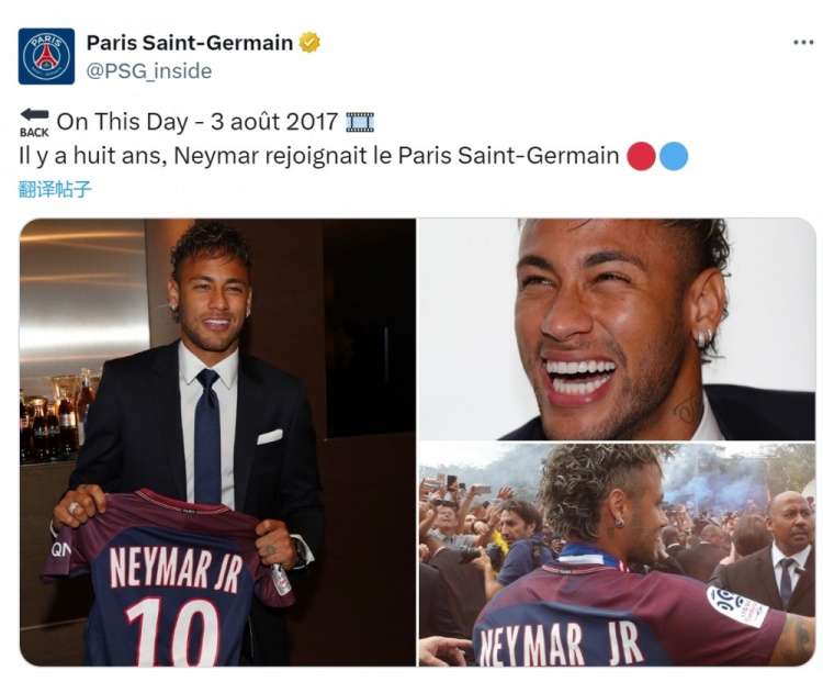 8月3日讯 巴黎官方更新社媒动态,回顾8年前的今天内马尔加盟球队。
